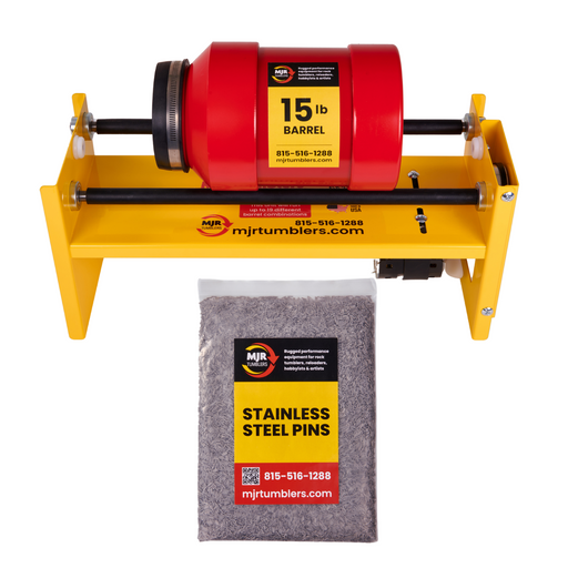 One Base Unit. Tumbling Barrel. Stainless Steel Pins. 5 pounds steel pins for the 15pound barrel and 10 pounds steel pins for the 40pound barrel. I...